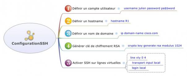 Router> Router>en Router#conf t Enter configuration commands, one per line. End with CNTL/Z. Router(config)# Router(config)# Router(config)#username julien password pa$$word Router(config)# Router(config)#hostname R1 R1(config)# R1(config)#ip domain-name cisco.com R1(config)# R1(config)#crypto key generate rsa modulus 1024 % Generating 1024 bit RSA keys, keys will be non-exportable...[OK] R1(config)# *mars 1 0:1:56.0: %SSH-5-ENABLED: SSH 1.99 has been enabled R1(config)# R1(config)#line vty 0 4 R1(config-line)#transport input ssh R1(config-line)#login local R1(config-line)#exit R1(config)#exit R1#