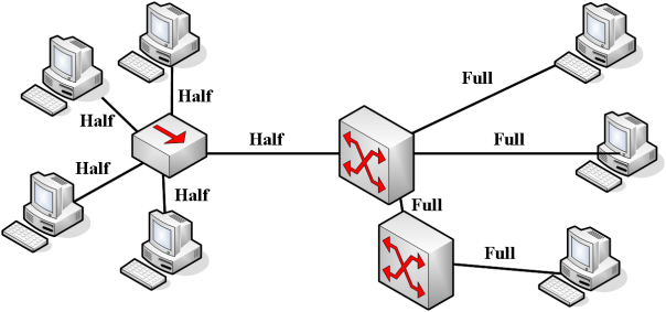 Quand on branche une carte réseau sur un HUB, on utilise la même paire de cuivre pour l’aller et pour le retour. Donc il faut forcément qu’une entité se taise pour que l’autre puisse lui envoyer une donnée. Comment savoir si en face on parle ? Grâce à la méthode CSMA/CD (lire le chapitre CSMA/CD pour comprendre). Ce fonctionnement se nomme Half-Duplex.