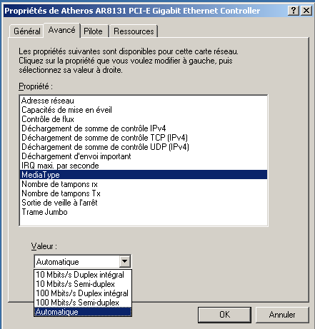 Attention : si vous forcez le mode sur votre carte réseau, ça désactive l’auto-négociation donc il faut aussi forcer le mode sur le port du switch sur lequel vous êtes connecté.