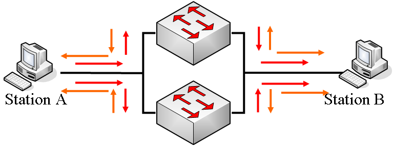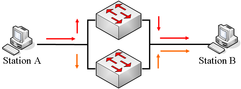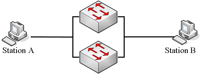 Avec cette architecture, on voit bien que si le switch du haut ne fonctionne plus, le switch du bas peut tout même transmettre les paquets de A vers B et de B vers A.