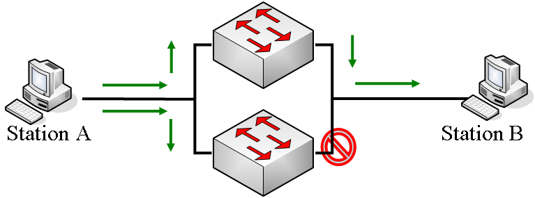 Dans notre exemple, tout le trafic passera par le switch du haut pour joindre la station B, le chemin du bas étant bloqué au niveau du port du switch du bas.