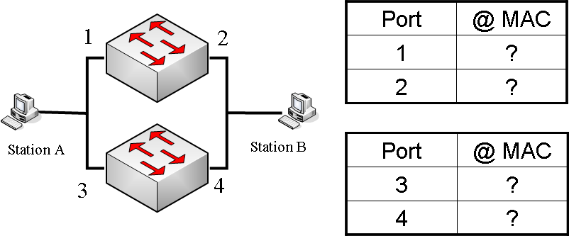 - Le switch du haut reçoit la trame sur son port (flèche rouge), extrait l’adresse MAC de destination (B) et la commute sur le port de droite. La station B reçoit bien la trame de la station A