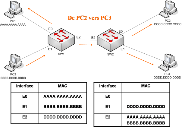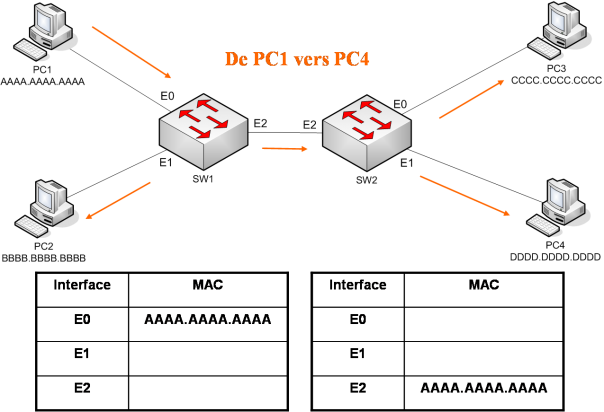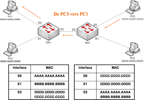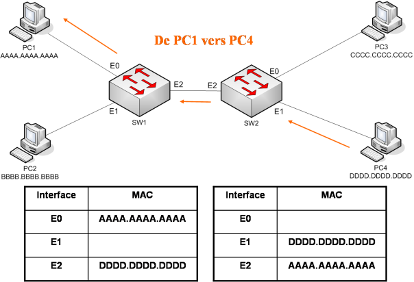 Dans le schéma ci dessus, on voit bien que les adresses des 4 PC sont bien dans chacune des tables de SW1 et SW2.