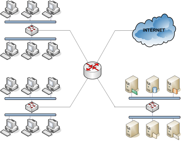 - les switchs sont connectés entre eux par un routeur. La présence ici du routeur vient du fait qu’on souhaite sortir vers Internet (le nuage bleu), sa présence est donc obligatoire.