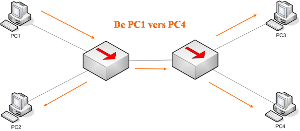 Chaque PC est connecté à un switch et dans de grande topologie, on branche des switchs entre eux pour avoir une plus forte densité de ports.