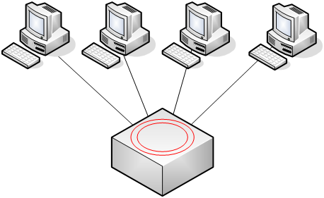 On peut schématiser physiquement une topologie en étoile comme ceci :