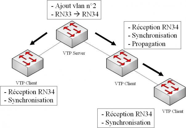 A chaque création/suppression/modification de VLAN, une variable appelée RN – Revision Number – s’incrémente (initialement 0 puis 1 puis 2 puis 3…). A chaque création/suppression/modification de VLAN, le switch Server envoi un message VTP avec la nouvelle valeur du RN. Les autres switchs compare le RN reçu du switch Server avec le RN qu’ils stocke en local, si ce dernier est plus petit (logiquement) alors les switchs se synchronisent avec le Server et récupère la nouvelle base de données des VLANs.