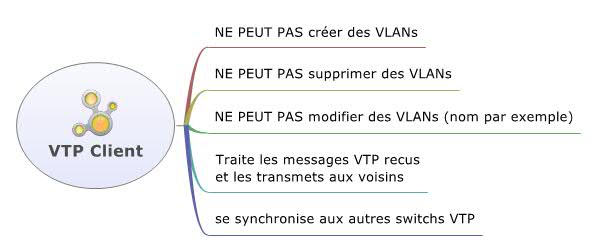 - VTP Client : switch qui reçoit, se synchronise et propage les annonces VTP