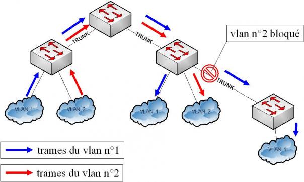 Explication : imaginons qu’un switch reçoit les VLANs 1 et 2 mais qu’aucunes de ses interfaces appartiennent au VLAN 2. Lorsque le switch voisin lui enverra des trames du VLAN 2, ce switch les supprimera car aucune de ses interfaces appartiennent à ce VLAN. Il est donc inutile que le switch voisin lui envoi du trafic pour le VLAN 2.